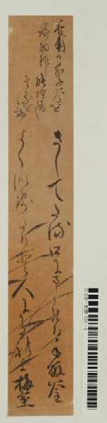 桜井梅室詞書善甫の茄子釜を鋳物師能模寫したるをみて 本文さしてたる口にまかする手取釜 署名梅室 読み下だし英訳メタ情報略伝* 桜井梅室( ~嘉永5年) 俳人。名は能充。俳号は初め雪雄、素信又は素心、後に梅室と改め通称とした。方円斎、陸々等の別号がある。金沢の人、加州公の刀研師桜井新九郎の子、十六歳俳諧に志し槐庵馬来、高桑闌更に師事した。後家職を弟子に譲り京に上って俳諧以て立つに至った。その間、江戸滞留十余年の後、金沢に帰省したが再び京に上り嘉永四年には、二条家から花の下宗匠の許しを得た。「梅室家集」「方円俳諧集」等の著作がある。嘉永五年十月一日没、年八十四。(嘉永五 文雅)