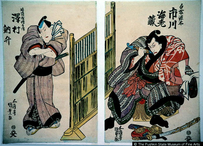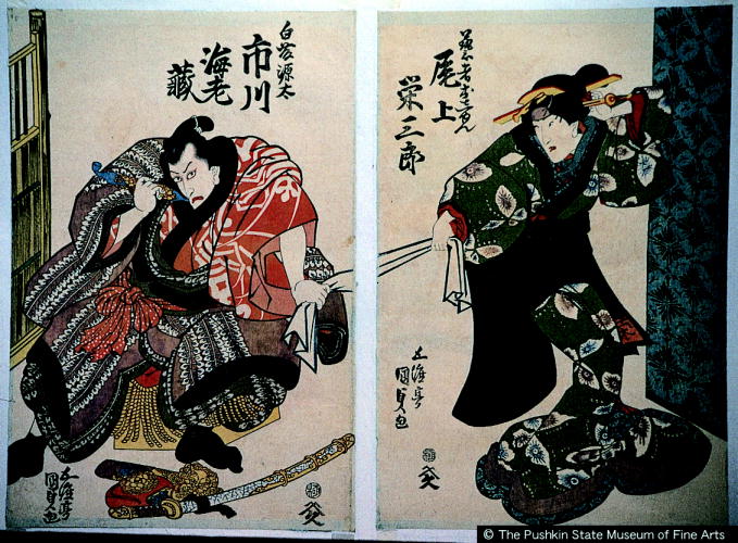 芸者おしゆん 尾上栄三郎、白藤源太 市川海老蔵、井筒屋伝兵衛 沢村訥升/ Onoe Eizaburoo in the Role of Geisha Oshun/Ichikawa Ebizoo in the Role of Shirafuji Genta/Sawamura Toshishoo in the Role of Izutsuya Denbei |