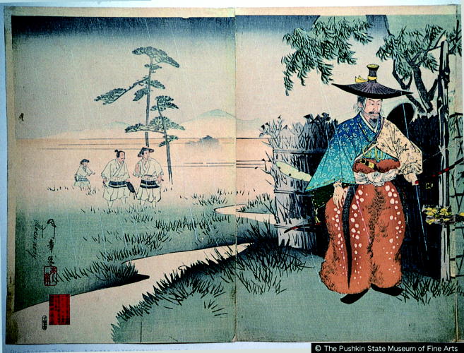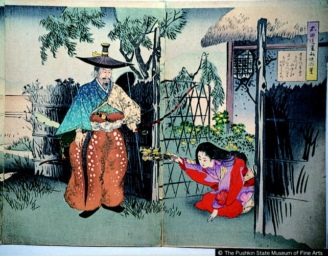 大田道潅山吹の里/ Ootadookan Visiting a Country House with Blooming Kerria |