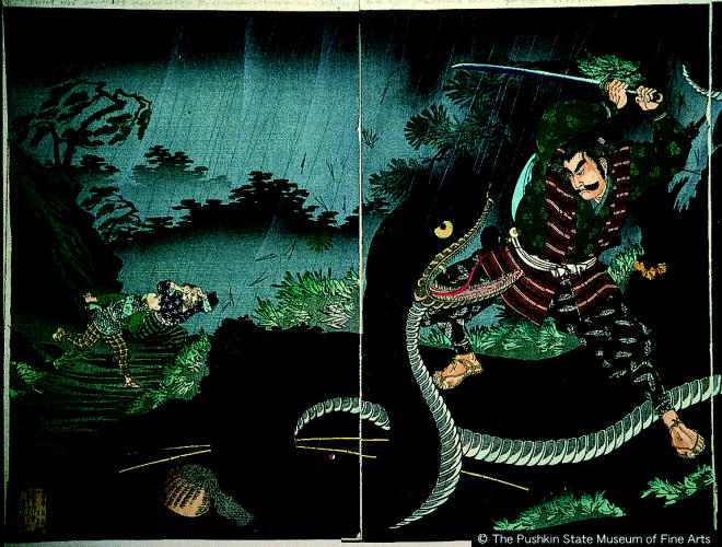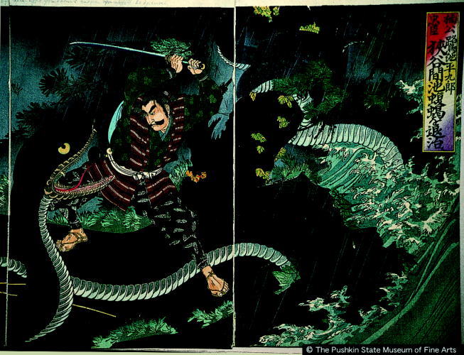 楠公忠臣鷺池平九郎狭谷間池蝮蝎を退治ス/ Nanko Chuushin Sagiike Heikuroo Subduing a Viper at Hazama Pond |