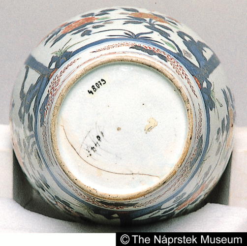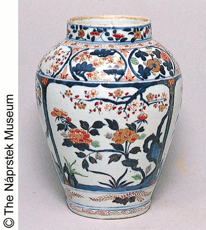 色絵牡丹菊梅枝垂桜蓋付壷(蓋欠)/ Jar with design of peonies, chrysanthemums, plum blossoms, and hanging cherry blossoms (missing lid) |