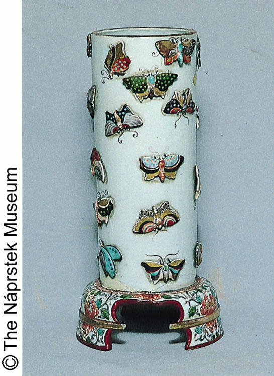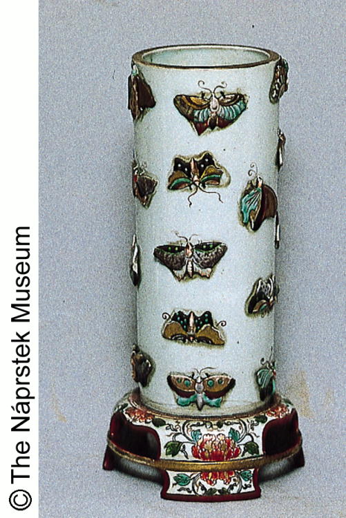 色絵蝶文筒形花生/ Cylinder flower vase with design of butterflies |