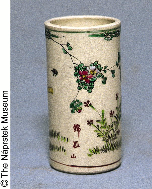 色絵陶器婦人草花文筒形花生/ Cylinder flower vase with scenes of women, grasses and flowers |