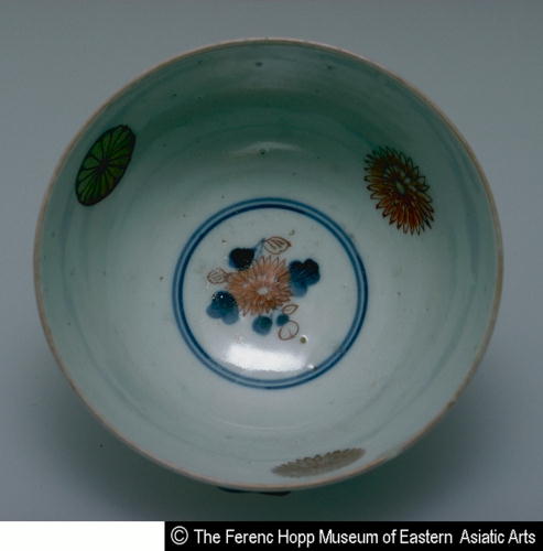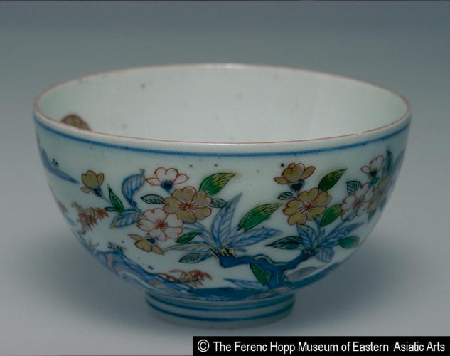 色絵桜芭蕉山水文碗/ Cup with design of cherry blossoms, banana plants, and landscape |