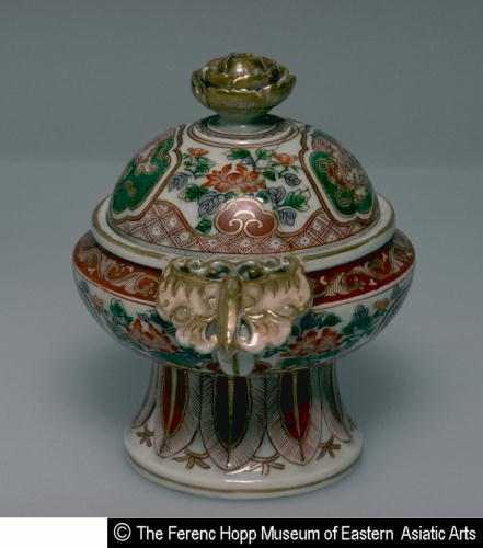 色絵獅子牡丹文蓋付台鉢/ Pedestaled covered bowl with design of Chinese lions and peonies |