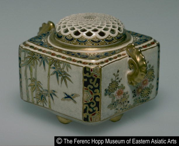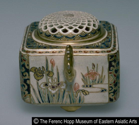 色絵梅竹菊菖蒲文蓋付四足香炉/ Incense burner with design of plum, bamboo, chrysanthemums, and irises |