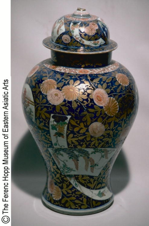 色絵藤葡萄山水文蓋付壷/ Covered jar with design of wisteria, grapes, and landscape scenes |