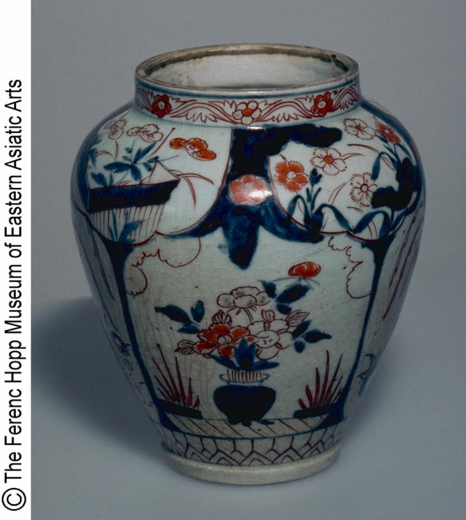 色絵鳳凰花盆文蓋付壷(蓋欠)/ Jar with design of phoenixes and flower arrangements (missing lid) |