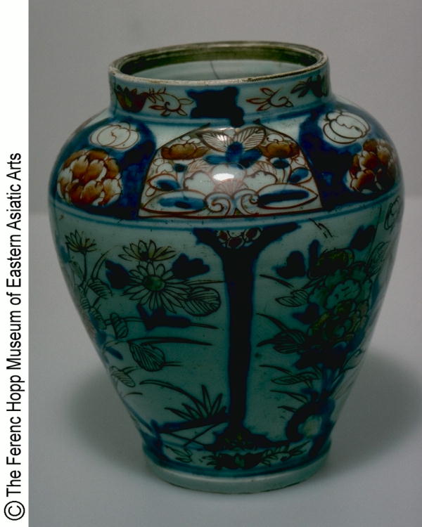 色絵柘榴菊牡丹文蓋付壷(蓋欠)/ Jar with design of pomegranates, chrysanthemums, and peonies (missing lid) |