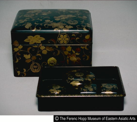 上り藤加字紋散鉄線唐草蒔絵十二手箱/ 12-tiered box with design of scattered lupin crests and karakusa |