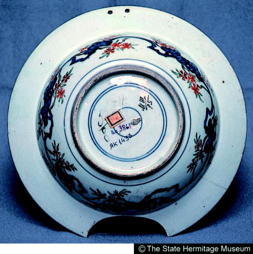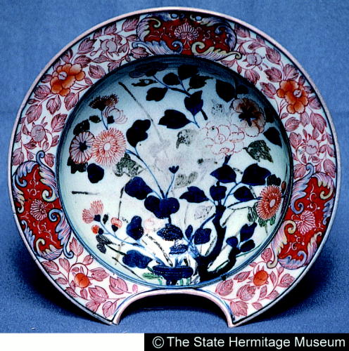 伊万里色絵牡丹菊文髭皿/ Barber's bowl with design of peonies and chrysanthemums |