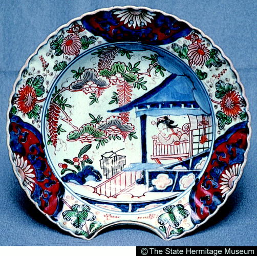 伊万里色絵楼閣美人文髭皿/ Barber's bowl with design of a woman in a pavilion |