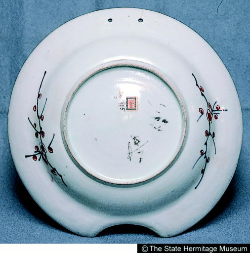 伊万里色絵縁先美人文髭皿/ Barber's bowl with design of a beauty on a veranda |