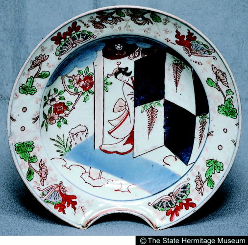 作品名 伊万里色絵縁先美人文髭皿/ Barber's bowl with design of a beauty on a veranda
