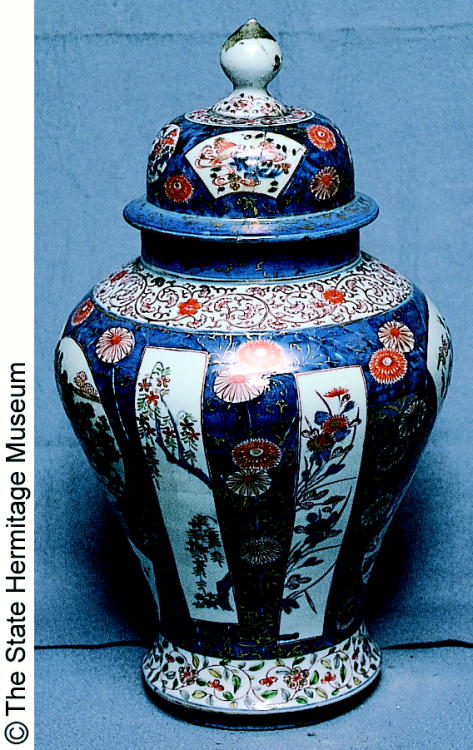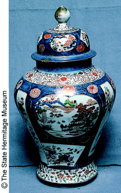 伊万里色絵山水楼閣文有蓋壷/ Covered jar with design of pavilion in a landscape |