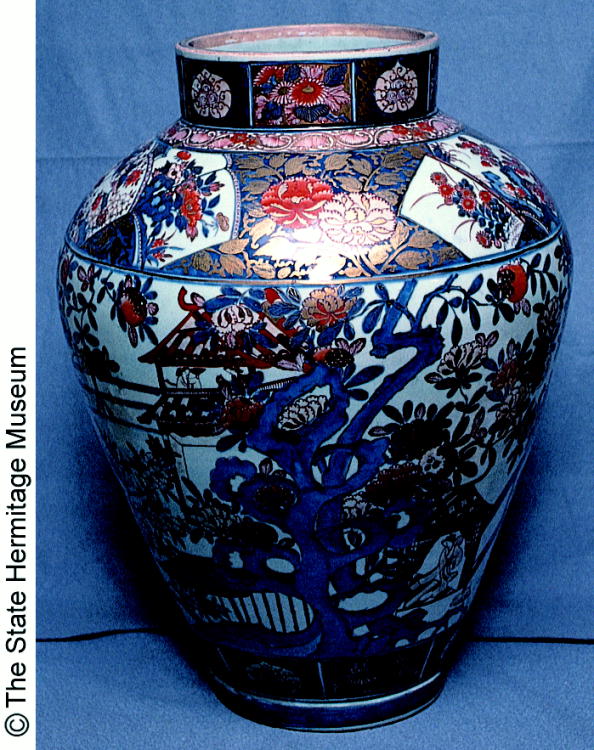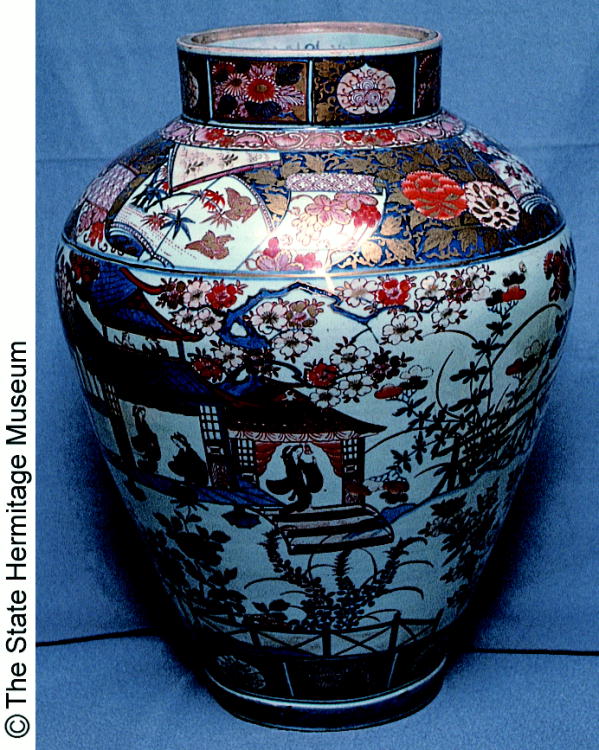 伊万里色絵人物建物文壷/ Jar with design of figures and buildings |