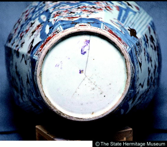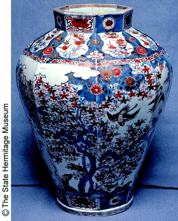 伊万里色絵鯉桜鶴文八角壷/ Octagonal jar with design of carp, cranes, and cherry blossoms |