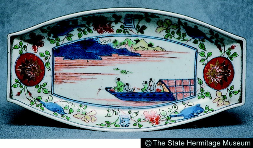 伊万里色絵舟人物文舟形皿/ Boat-shaped plate with design of figures in a boat |