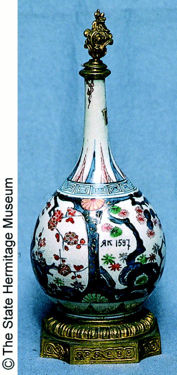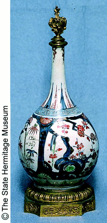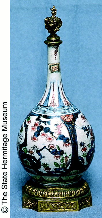 伊万里色絵花卉文金具付瓶/ Bottle with metal fixtures and design of flowers and grasses |
