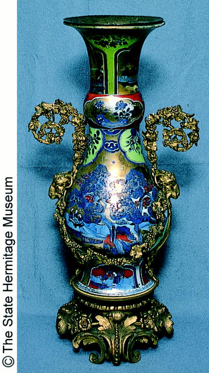 山水人物文金具付瓶/ Bottle with metal fixtures with design of landscape and figures |