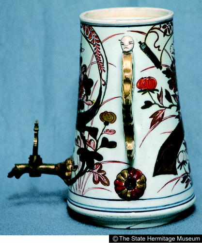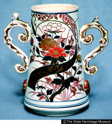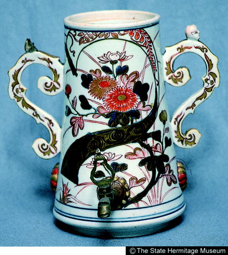 伊万里色絵菊牡丹文耳付水注/ Jar with design of chrysanthemums and peonies |