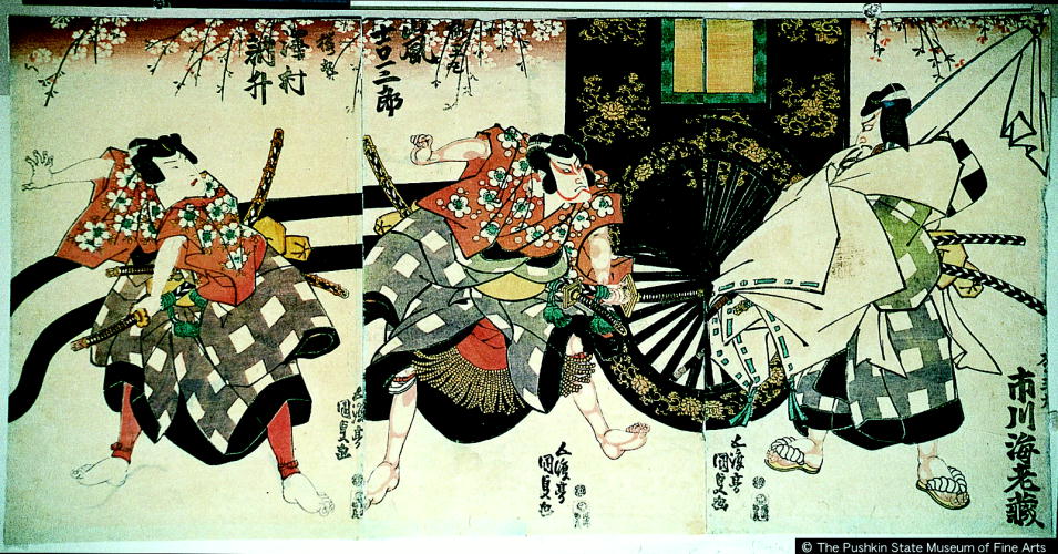 作品名 松王丸 市川海老蔵、梅王丸 嵐吉三郎、桜丸 沢村訥升/ Ichikawa Ebizoo in the Role of Matsuoomaru/Arashi Kichisaburoo in the Role of Umeoomaru/Sawamura Toshishoo in the Role of Sakuramaru
