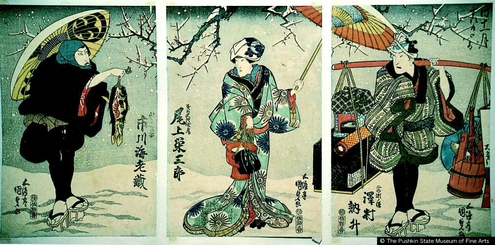 二の瀬ノ源 沢村訥升、義太夫語竹房 尾上栄三郎、■の安 市川海老蔵/ Sawamura Toshishoo in the Role of Ninose no Gen/Onoe Eizaburoo in the Role of Gidayuu Gatari Takefusa/Ichikawa Ebizoo in the Role of ? no Yasu |