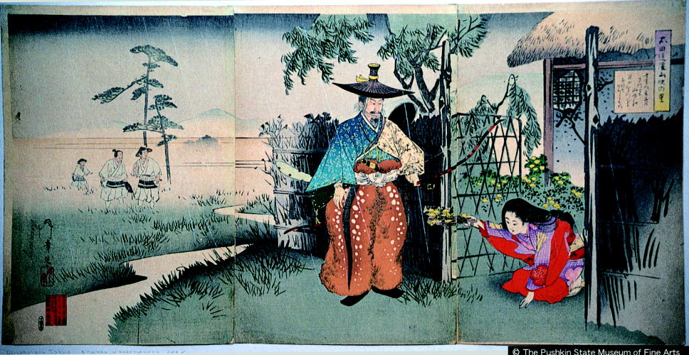大田道潅山吹の里/ Ootadookan Visiting a Country House with Blooming Kerria |
