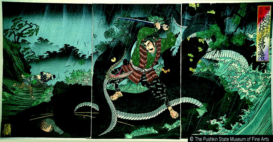 楠公忠臣鷺池平九郎狭谷間池蝮蝎を退治ス/ Nanko Chuushin Sagiike Heikuroo Subduing a Viper at Hazama Pond |