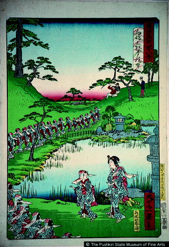 東京名所四十八景 (二)向島三紅亭座中/ Tokyo meisho shijuuhakkei Two: Gathering by the Sankootei, Mukoojima |
