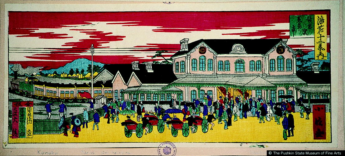 浪花十二景之内 鉄道寮蒸気車/ Naniwa juunikei no uchi Steam Locomotive at a Train Station |