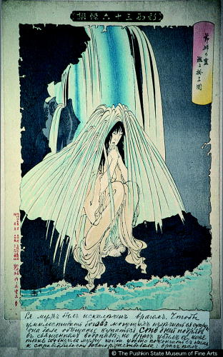 新形三十六怪撰 節婦の霊瀧に掛る図/ Shinkei sanjuurokkaisen Virtuous Woman Sitting Under a Sacred Waterfall |