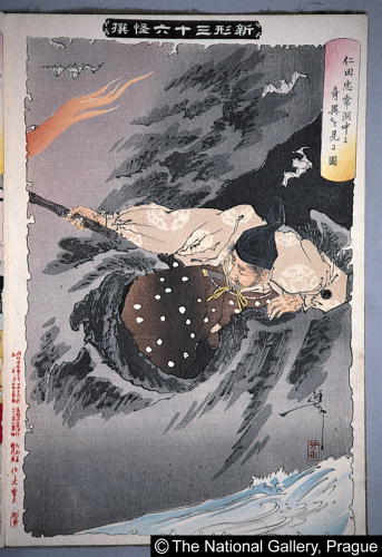 新形三十六怪撰 仁田忠常洞中に奇異を見る図/ Shingata sanjuurokkaisen Nitta no Tadatsune Seeing an Apparition in a Cave |