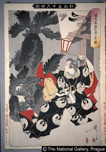 新形三十六怪撰 蘭丸蘇鉄之怪ヲ見ル図/ Shingata sanjuurokkaisen Ranmaru Looking at the Ghostly Cycad |
