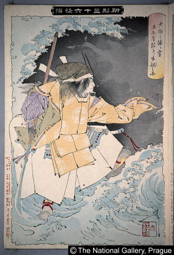 新形三十六怪撰 大物之浦に霊平知盛海上に出現之図/ Shingata sanjuurokkaisen The Ghost of Taira no Tomomori Appearing at Daimotsu Bay |