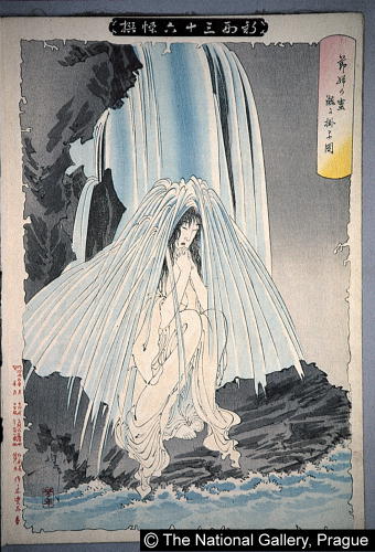 新形三十六怪撰 節婦の霊瀧に掛る図/ Shingata sanjuurokkaisen Virtuous Woman Sitting Under a Sacred Waterfall |