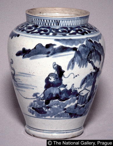 染付唐子山水文蓋付壷(蓋欠)/ Jar with design of Chinese children and landscape (missing lid) |