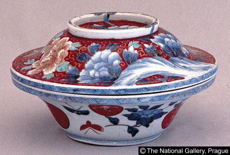 色絵岩牡丹文蓋付鉢/ Covered bowl with design of rocks and peonies |