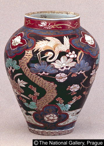 色絵松梅牡丹鶴文蓋付壷(蓋欠)/ Covered jar with design of pine, plum blossoms, peonies, and cranes (missing lid) |