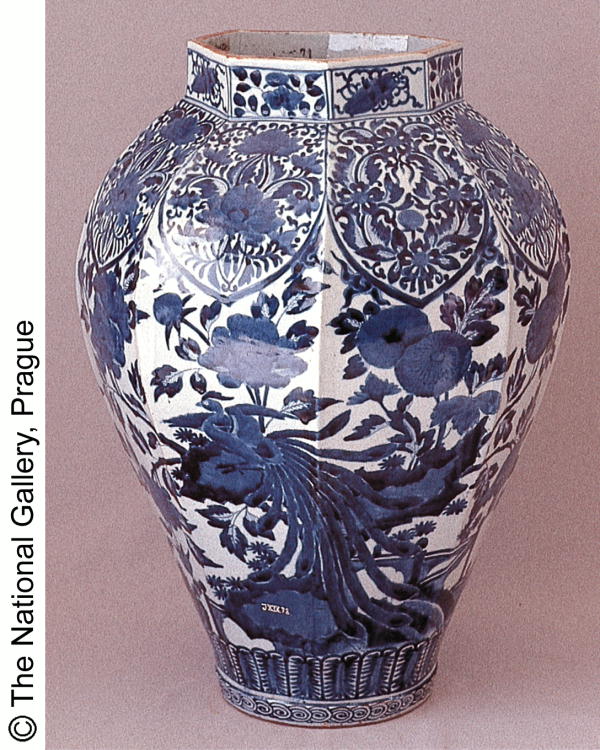 染付菊牡丹桐鳳凰文蓋付八角壷(蓋欠)/ Octagonal jar with design of chrysanthemums, peonies, paulownia, and phoenixes (missing lid) |