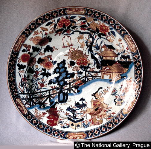 色絵楼閣婦人文大皿/ Large plate with scene of pavilion and women |