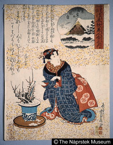 なには風俗浮連歌美人合之内 東御堂の暁雪/ Naniwa fuuzoku ukare uta bijin awase no uchi Early Morning Snow at Higashi Midoo |