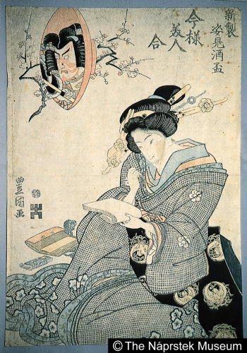 新製姿見酒盃 今様美人合 (文を書く女)/ Shinsei sugatami shuhai: Imayoo bijin awase [Woman Writing a Letter] |