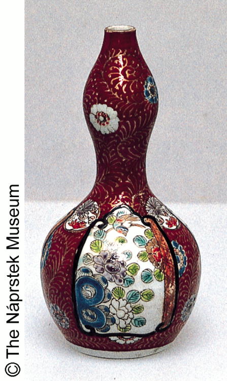 色絵牡丹梅松文瓢形瓶/ Gourd-shaped bottle with design of peonies, plum blossoms, and pine |