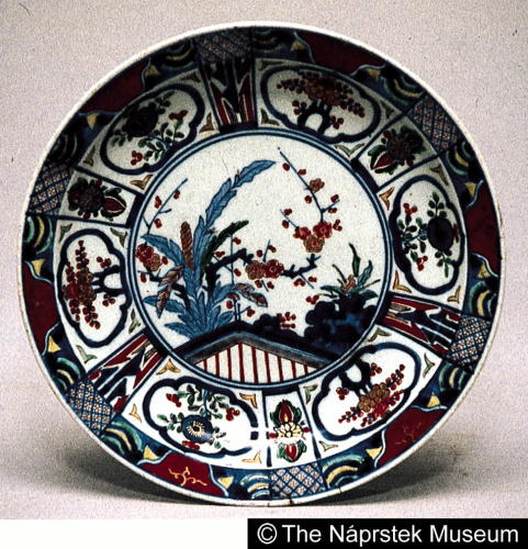 色絵芙蓉手芭蕉梅文皿/ Plate with faceted motifs, banana plants, and plum blossoms |
