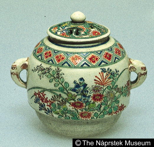色絵陶器秋草文茶釜形蓋付壷/ Covered jar with design of autumn grasses |