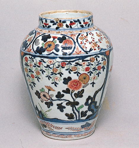 色絵牡丹菊梅枝垂桜蓋付壷(蓋欠)/ Jar with design of peonies, chrysanthemums, plum blossoms, and hanging cherry blossoms (missing lid) |