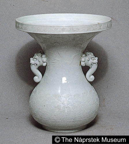 白磁雲鶴文獣耳付花瓶/ Flared flower vase with design of cranes and clouds |