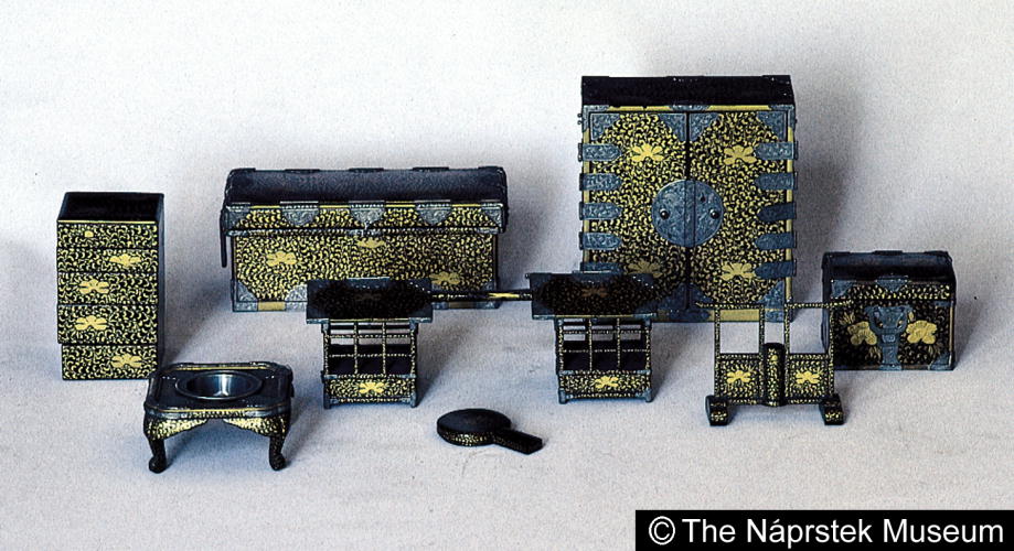 牡丹唐草蒔絵雛道具(長持・衣装箪笥・挟箱・重箱・茶弁当・矢台・鏡箱・手焙)/ Doll utensils |