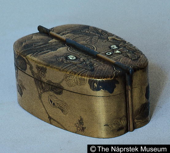 楼閣人物蒔絵軍配形香箱/ Small box in the shape of a sumoo referee's fan |